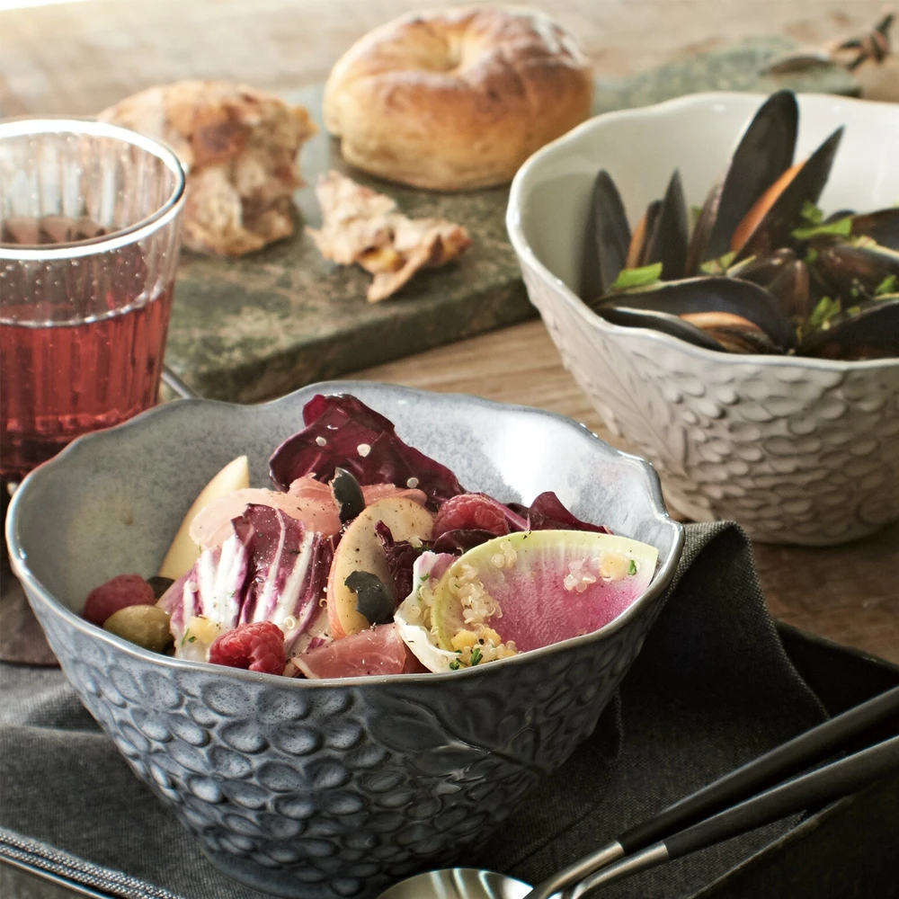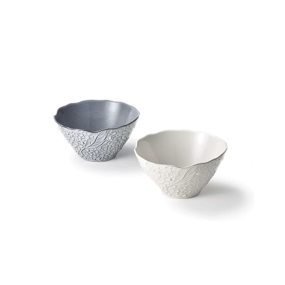 The set features two bowls, contrasting in hue with one showcasing a light, creamy shade and the other a deep slate gray.