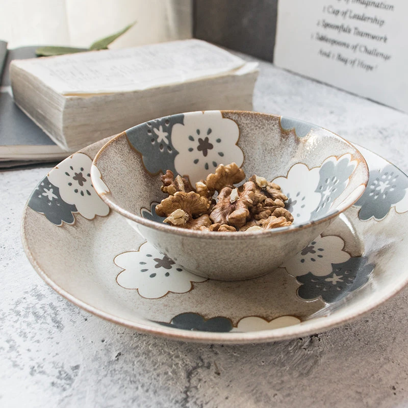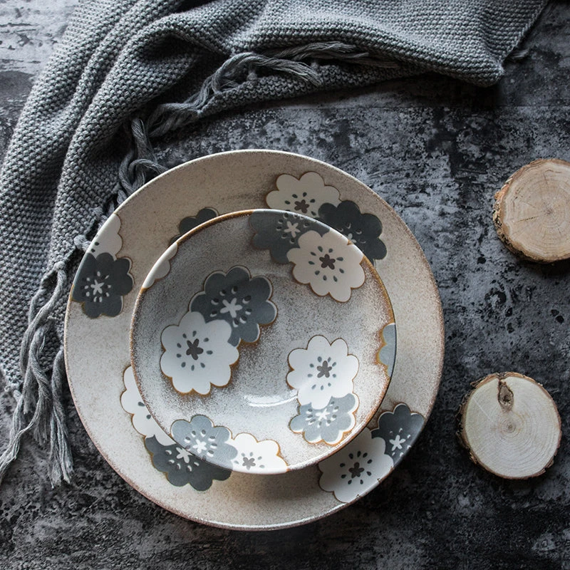 This cute little plate mixes the shape of flowers with traditional Japanese hand painting. The dinner plate features white and light blue flowers against a linen background.