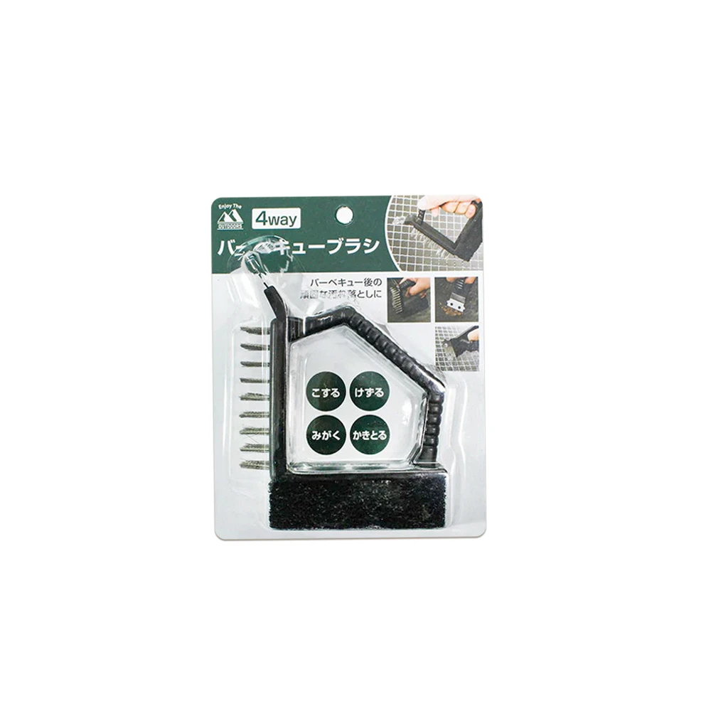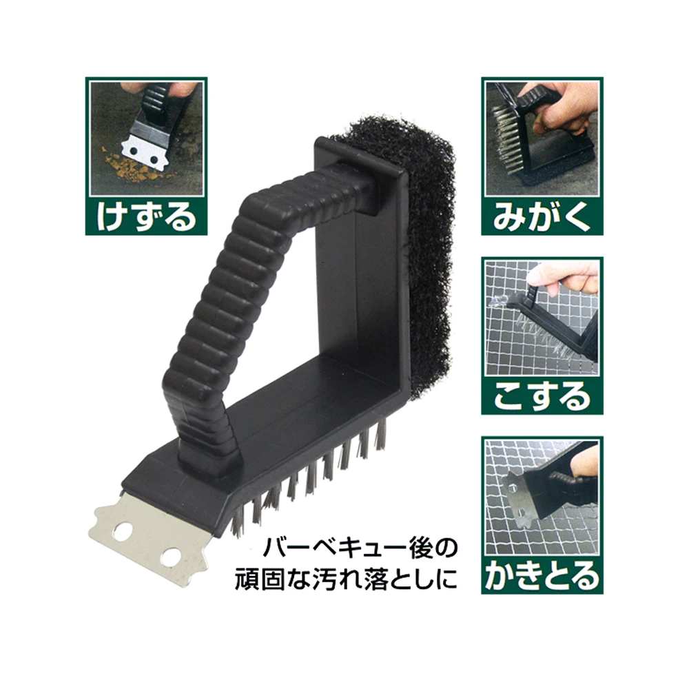 The product features a robust design with a metal scraper to remove burnt-on food and a mesh brush for thorough cleaning between the grates. The handle is ergonomically shaped, providing a firm grip to ensure safety and ease during use.