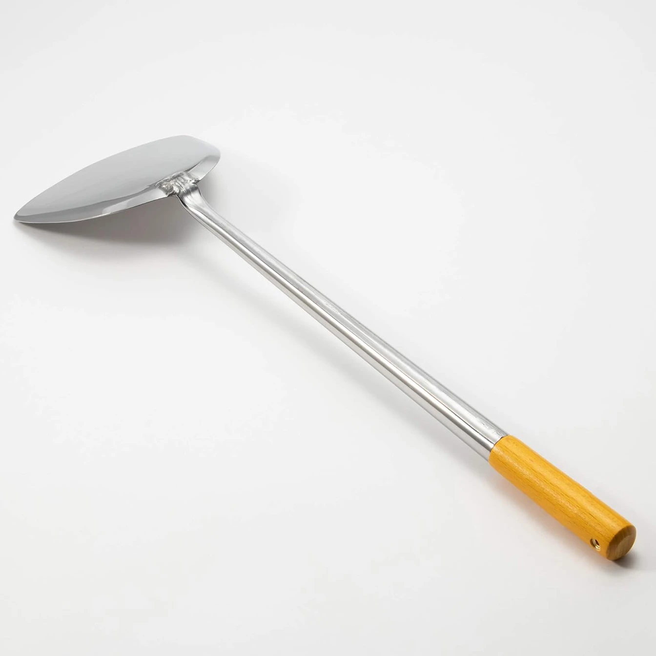 The Endo Shoji Stainless Steel Turner is crafted in Japan from stainless steel, featuring a teardrop-shaped blade designed for Asian-style cooking. The blade is wide and gently curved, allowing for easy flipping and stir-frying. Its thin yet sturdy construction ensures durability and precision.
