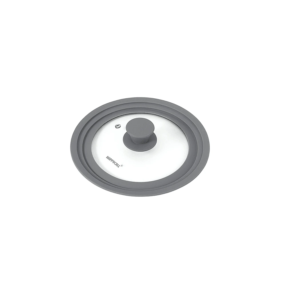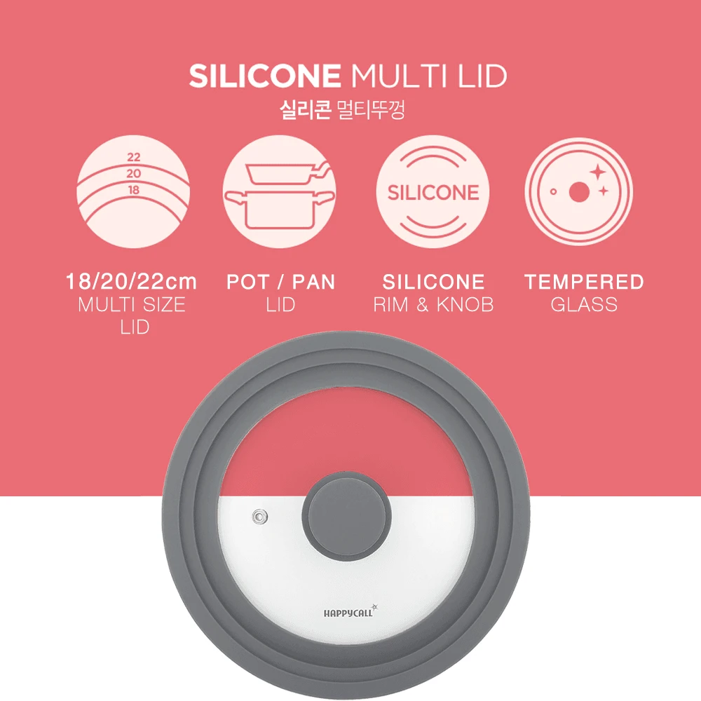 The lid is made with tempered glass and is equipped with a steam vent The silicone material helps seal the heat over the edge. This lid fits Happycall saucepans with diameters of 18cm, 20cm, or 22cm.
