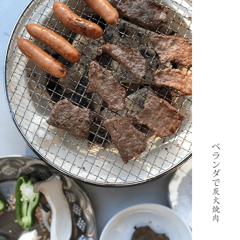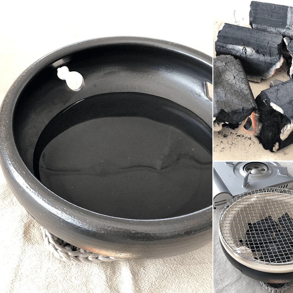Simply place clean water in the bottom of the main unit and then use a trivet for Japanese binchotan (white charcoal). Place the mesh on top. This combination allows the slow and even release of heat.