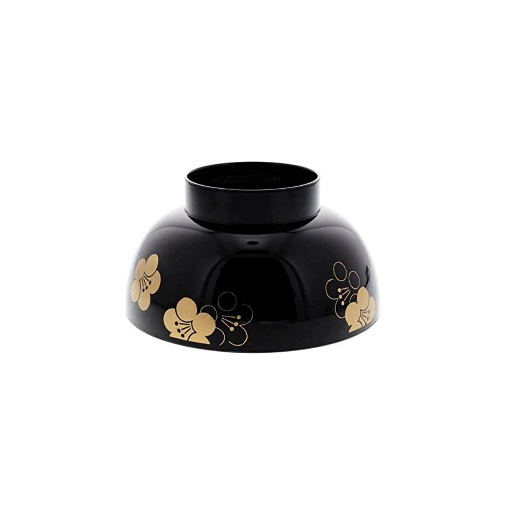 This beautifully crafted Japanese soup bowl showcases a striking plum blossom motif in gold against a deep black background, symbolising resilience and beauty in Japanese culture.
