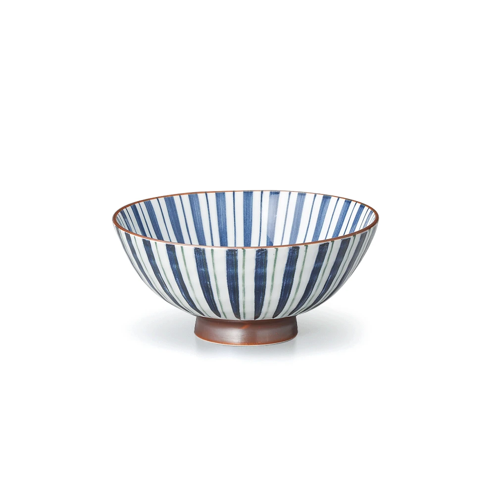 The pattern is rendered in a dual-tone palette, with lines in both a darker indigo and a softer blue, evoking the feel of traditional Japanese aesthetics. The bowl’s exterior is adorned with these vertical stripes that gently contrast against the crisp white ceramic background, while the rim is edged with a warm brown tone, providing an earthy counterbalance to the cool blues.