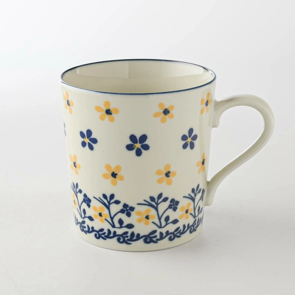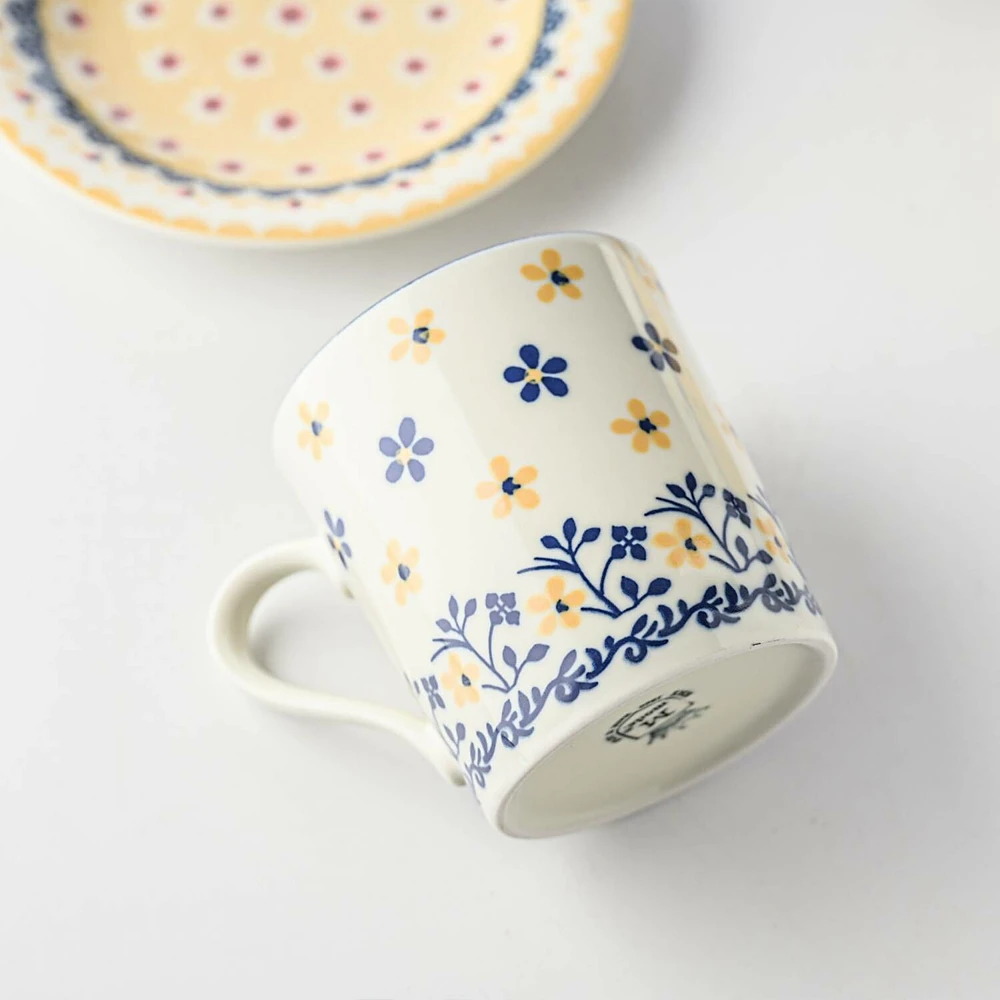 This delightful mug features a refreshing design of yellow and blue floral patterns, inspired by the charm of spring gardens. The cheerful lemon-hued blossoms and delicate blue accents create a playful yet elegant look, making it a standout piece in any collection.