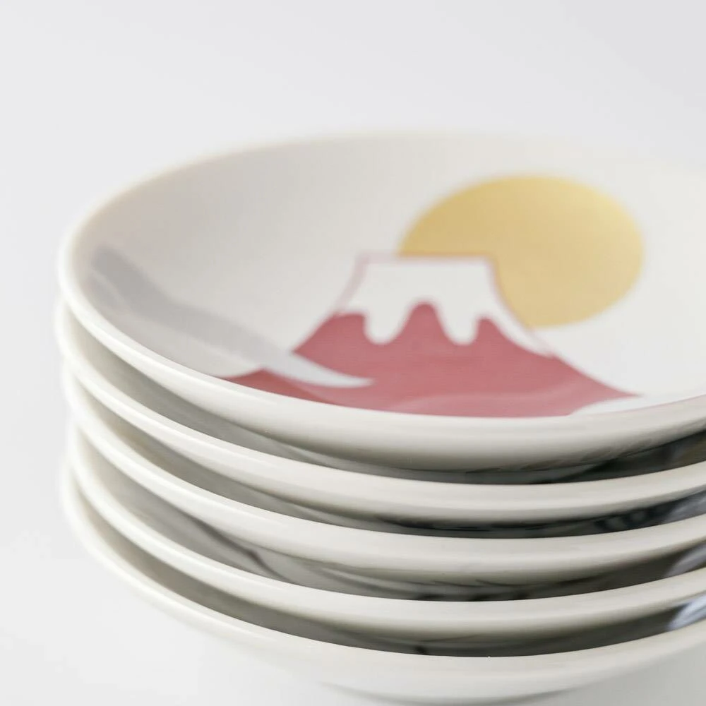 This exquisite plate showcases an iconic image of Mount Fuji in a vibrant red, crowned by a golden sun, and enveloped in playful white clouds. It perfectly marries traditional Japanese symbolism with a modern, pop-art sensibility.