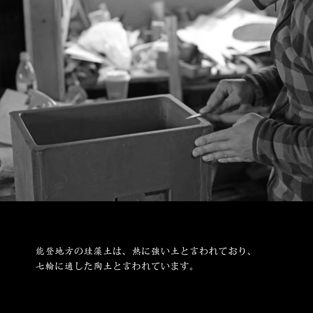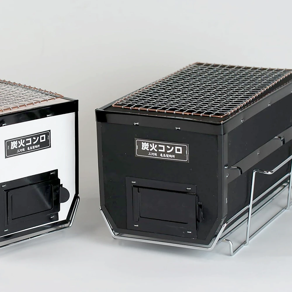 This Mikawa konro grill is manufactured in Kamejima, Mikawa, using formed diatomaceous earth, which offers strong heat insulation and efficient fuel use. The exterior is finished in black with metal corner brackets for added stability.