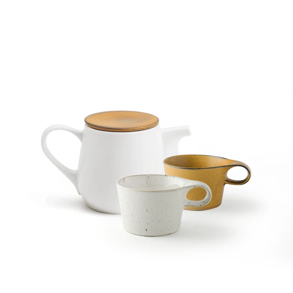 Accompanying the teapot are two unique porcelain mugs, each holding up to 150ml. The first mug showcases a speckled white glaze that brings a modern yet rustic charm to your table, while the second mug is finished in a striking mustard yellow that adds a pop of colour and vibrancy.