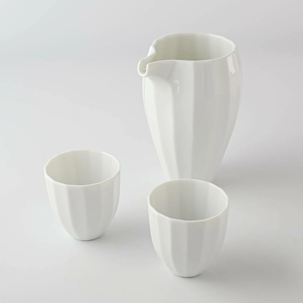 The Miyama Hibiki Sake Set is a refined example of traditional Japanese porcelain artistry. Crafted from high-quality white porcelain, this set features the Shinogi technique, where ridges are carved into the porcelain for a textured appearance. A clear glaze enhances these details, lending a subtle depth to the smooth, white surface.