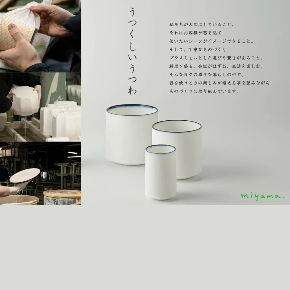 Miyama tableware is crafted with meticulous attention to the raw clay used to produce high-quality white porcelain. The clay, rich in glass components, is fired at temperatures up to 1350 degrees, resulting in tableware that combines a translucent whiteness with a smooth surface that’s easy to clean and remains beautiful over time.