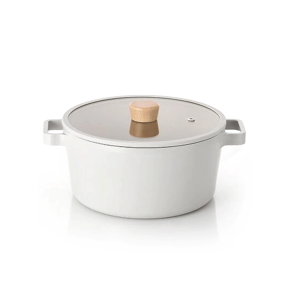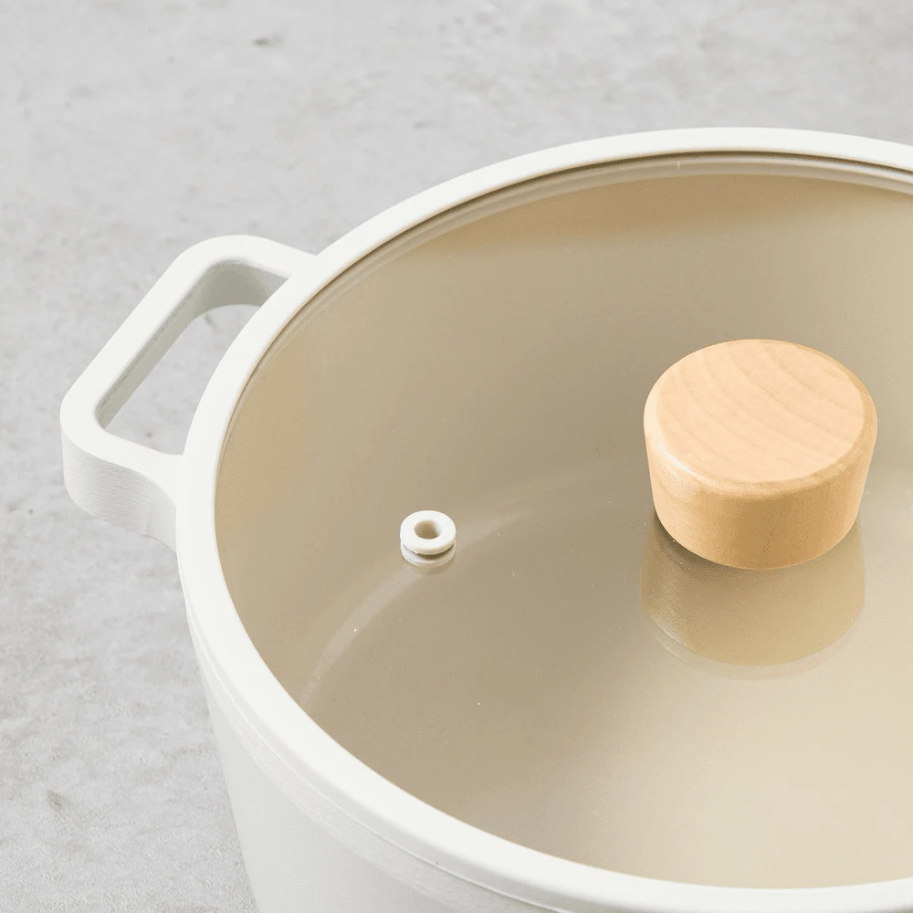 A Neoflam Fika ceramic nonstick pot in 5.4L with lid. Suitable for all cooktops, including induction. Fika is one of Neoflam’s most popular cookware series and features its light colour.
