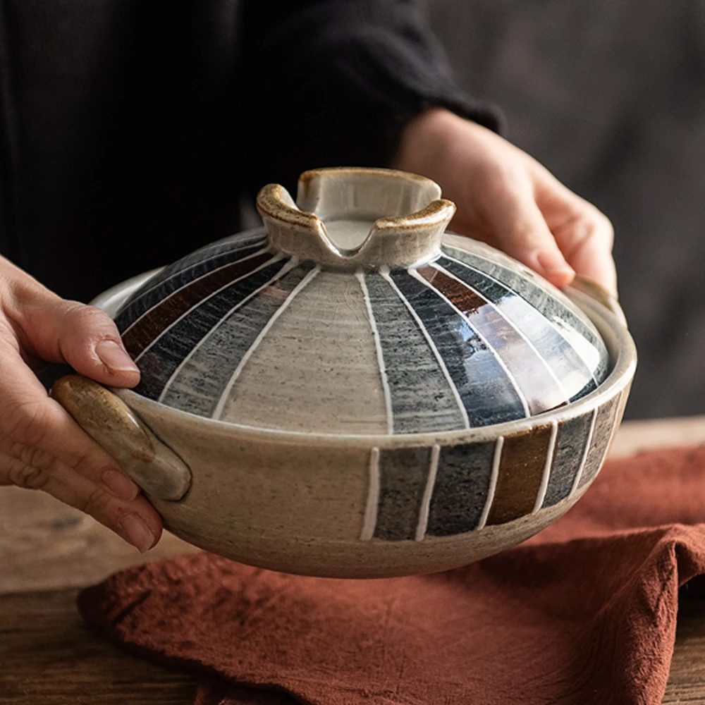 The clay pot’s round shape and robust handles are practical, while its crafted lid fits snugly, ensuring efficient heat conservation. The subtle variations in the glaze and the tactile quality of the clay offer a sense of rustic elegance, making it not only a useful kitchen item but also a decorative piece that embodies the essence of Japanese culinary tradition.