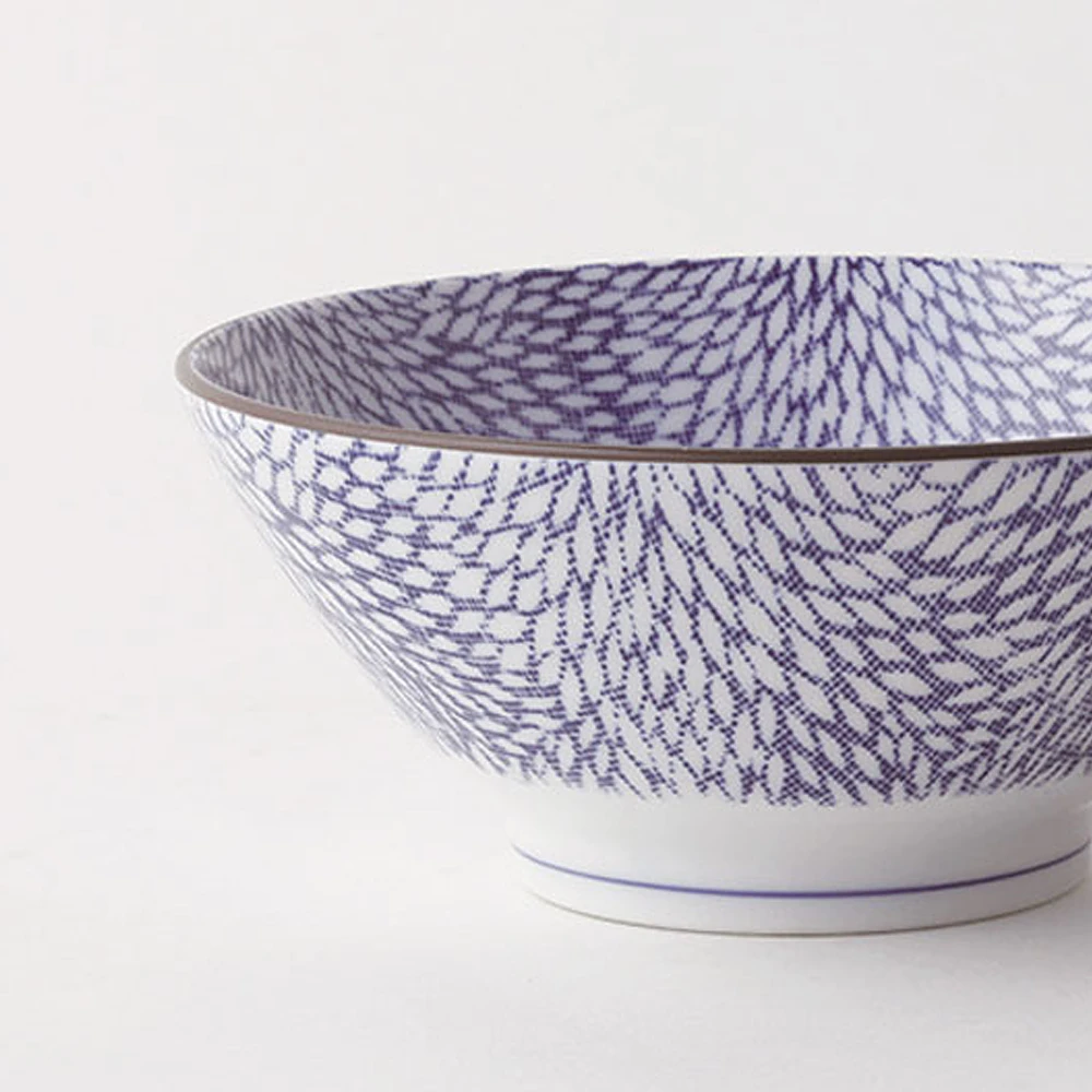 The bowl is adorned with classic shimakoushi patterns, featuring chrysanthemum motifs, which are emblematic of Japanese artistry. Ideal for serving soba noodles, it can also be versatile for other dishes. The design and size are apt for those who appreciate authentic Japanese tableware.