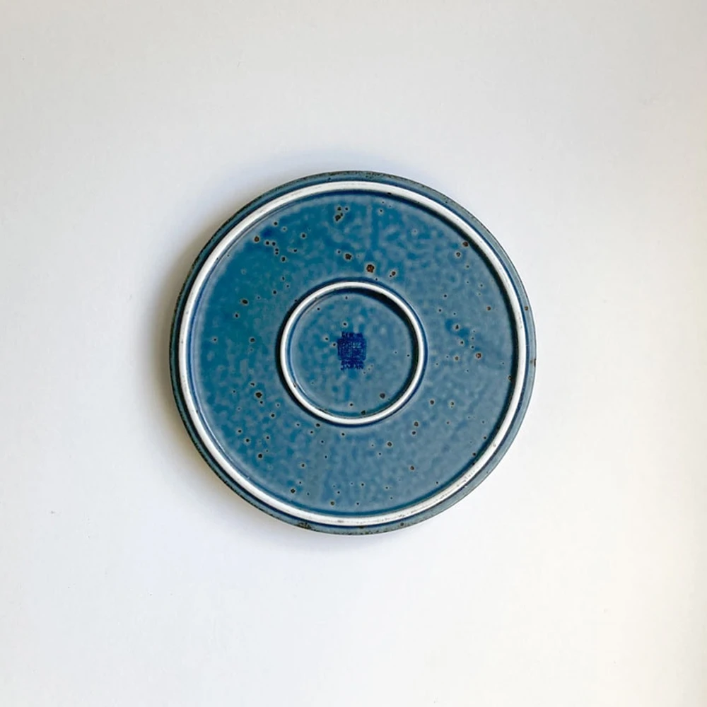 The plate features a distinctive deep blue hue with subtle speckles that add a unique texture to its finish, making each piece slightly different from the next. The slightly raised edge ensures practicality by helping to contain sauces and dressings.