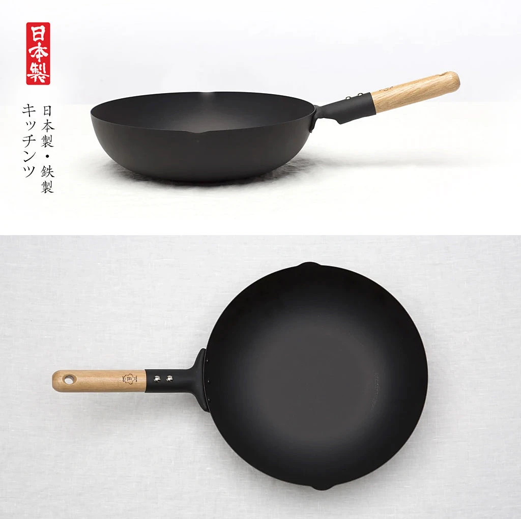 Crafted from high-grade Japanese carbon steel, the wok offers superior heat responsiveness and even heat distribution. Its matte black finish and ergonomic natural wooden handle showcase traditional Japanese cookware aesthetics, reflecting simplicity and utility in the kitchen.