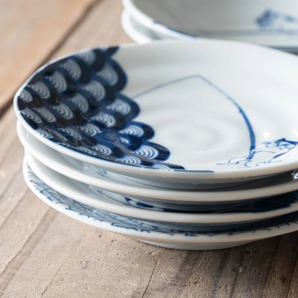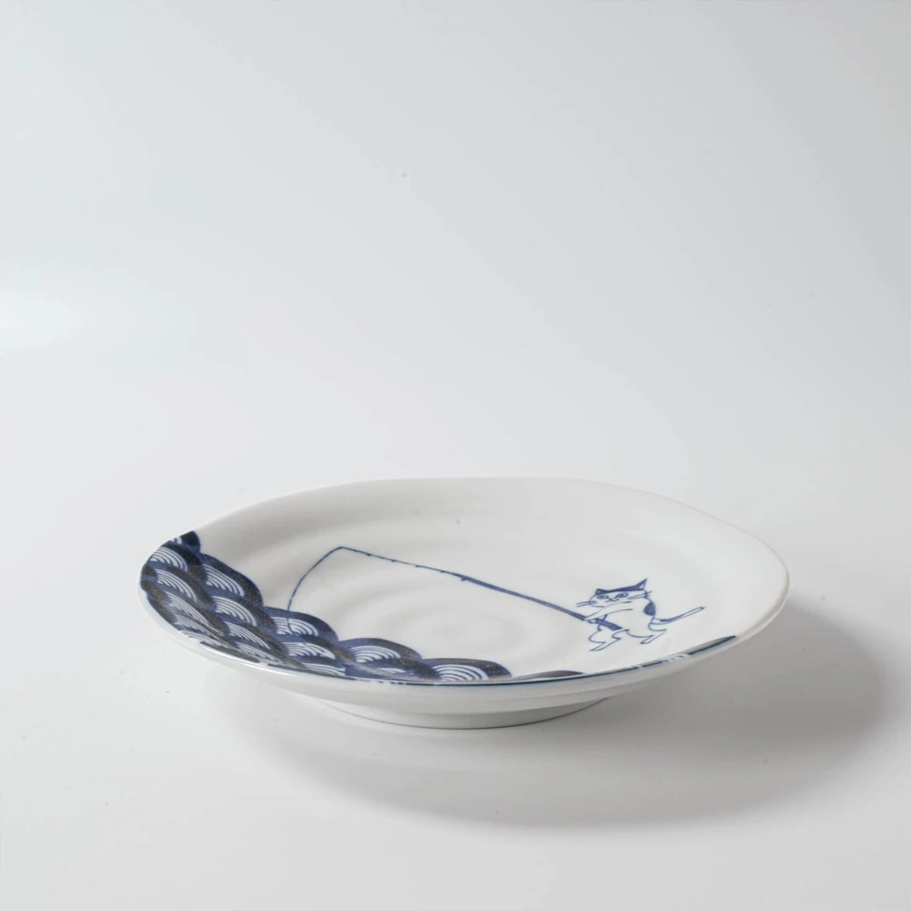 This plate from the Shichita Mino Yaki series merges playful charm with time-honoured design. A cat stands poised on a wave crest, casting its line into a field of seigaiha, the traditional Japanese motif symbolising peace and resilience.