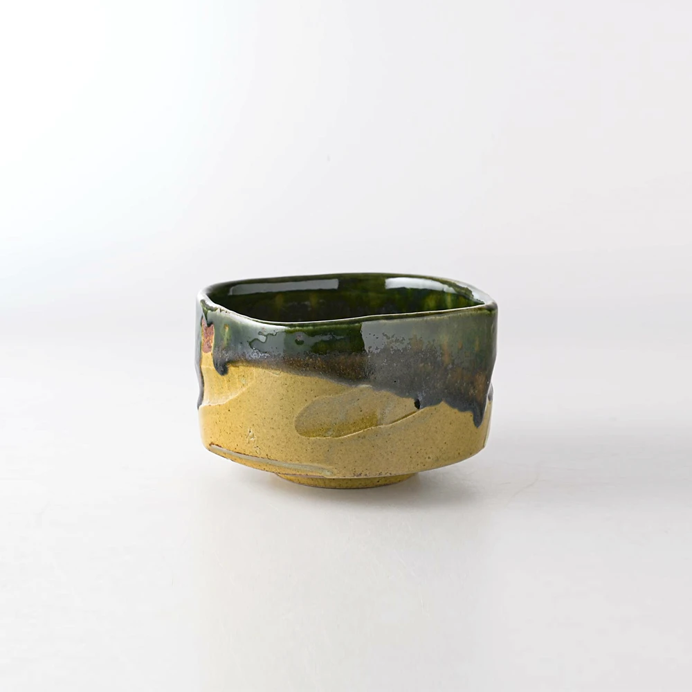 The bowl’s subtly irregular, square-like shape offers a distinctive touch, enhancing its rustic charm while providing a comfortable grip. The textured, matte lower half contrasts beautifully with the glossy, dark green upper rim, making it both a functional and aesthetic addition to any tea ceremony.