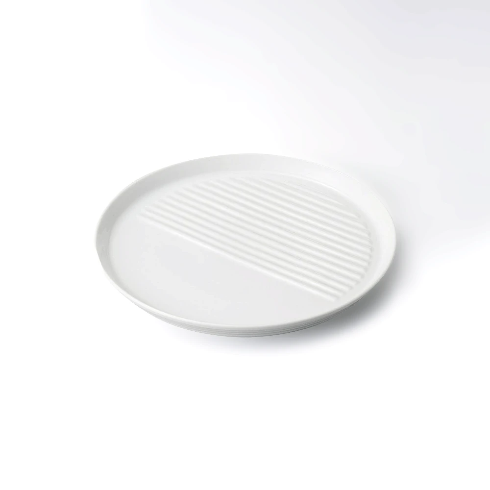 What makes this plate unique is its half-ribbed pattern. Covering only half of the plate’s surface, this pattern adds visual appeal while helping to drain excess oil and water from food. It also helps preserve the original texture of the food. Additionally, the three-dimensional ribbing assists in keeping foods like toast crispy for longer by reducing moisture retention.