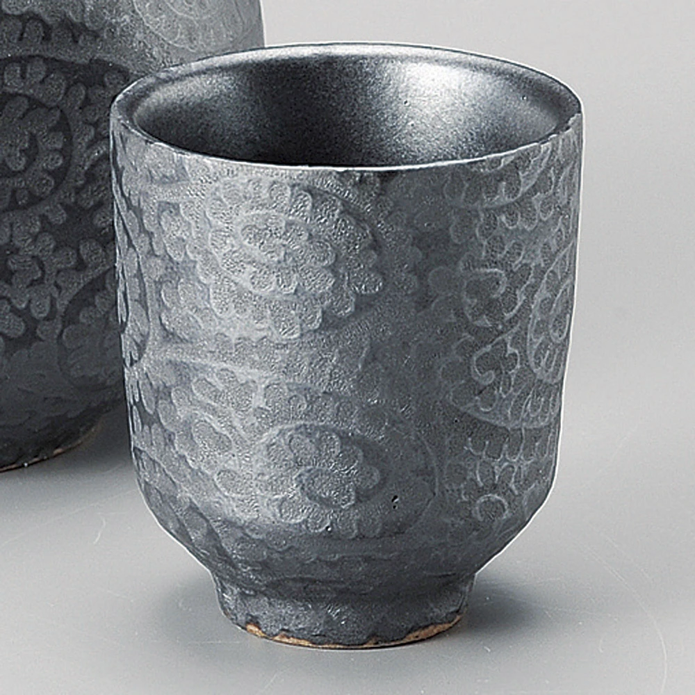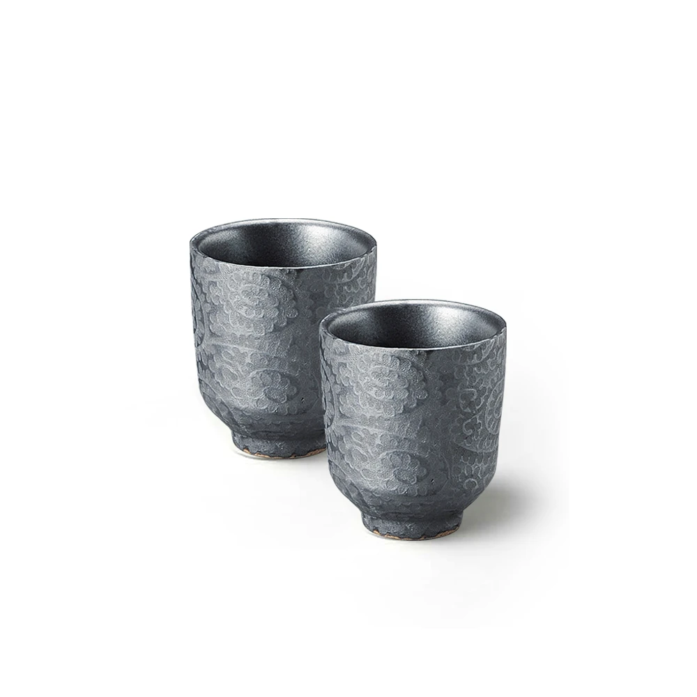 The Silver Crest Tang Grass Sake Cup set comprises two 90ml cups, each distinguished by its textured tang grass motif. The cups’ surfaces are adorned with raised patterns that offer a tactile experience, while their silver-gray palette exudes a subdued elegance.